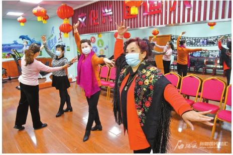 12月11日,在乌鲁木齐市天山区幸福路片区管委会湖东社区蒲公英社区学院的教室里,学员们有的对着镜子练习舞蹈,互相纠正动作,有的在练习发声。